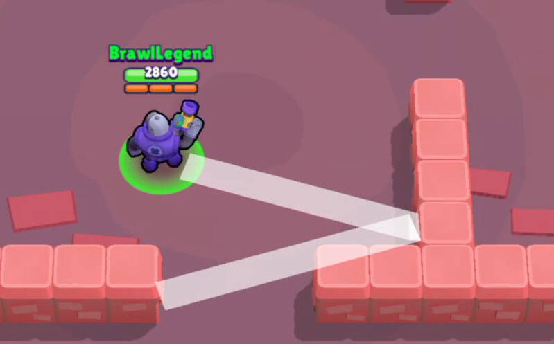 In Heist, standing right in the middle of the enemy team's safe before activating his Gadget will allow him to deal massive amounts of damage since all 8 of the bullets hit. The bullets can then bounce back and damage the safe even further.